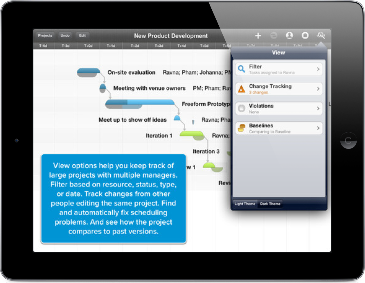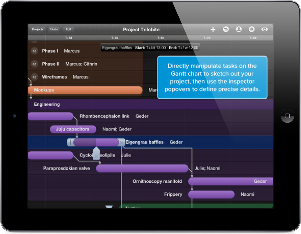 - Visual timelines: The Timeline (or Gantt Chart) view of your project displays activities in a calendar. Durations for each task are shown graphically in a time-phased diagram by day, week, month, quarter, or year. The Gantt view shows task start and stop times, dependencies, resources, or resource usage by task, all on a timeline. You can visually edit tasks and create dependencies (where a certain task can't begin unless another has finished) by dragging and connecting them in the Gantt view. OmniPlan's graphical display of your project's information helps you quickly assess status and proactively manage deadlines.